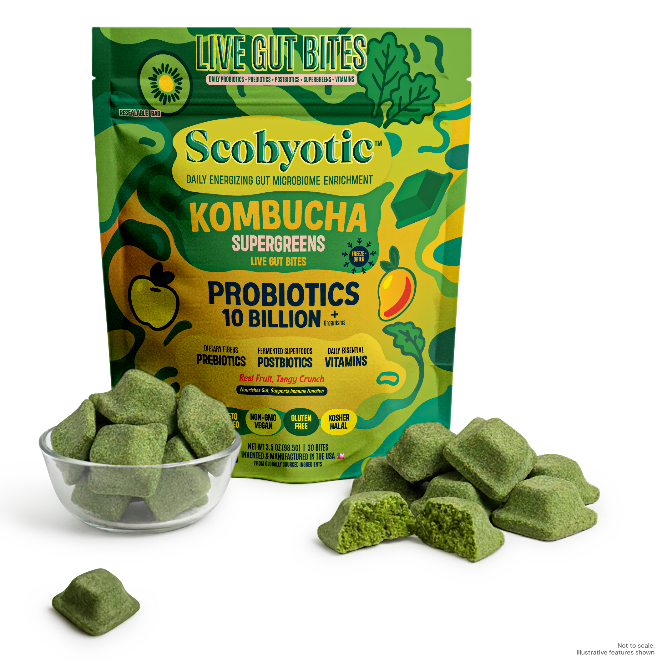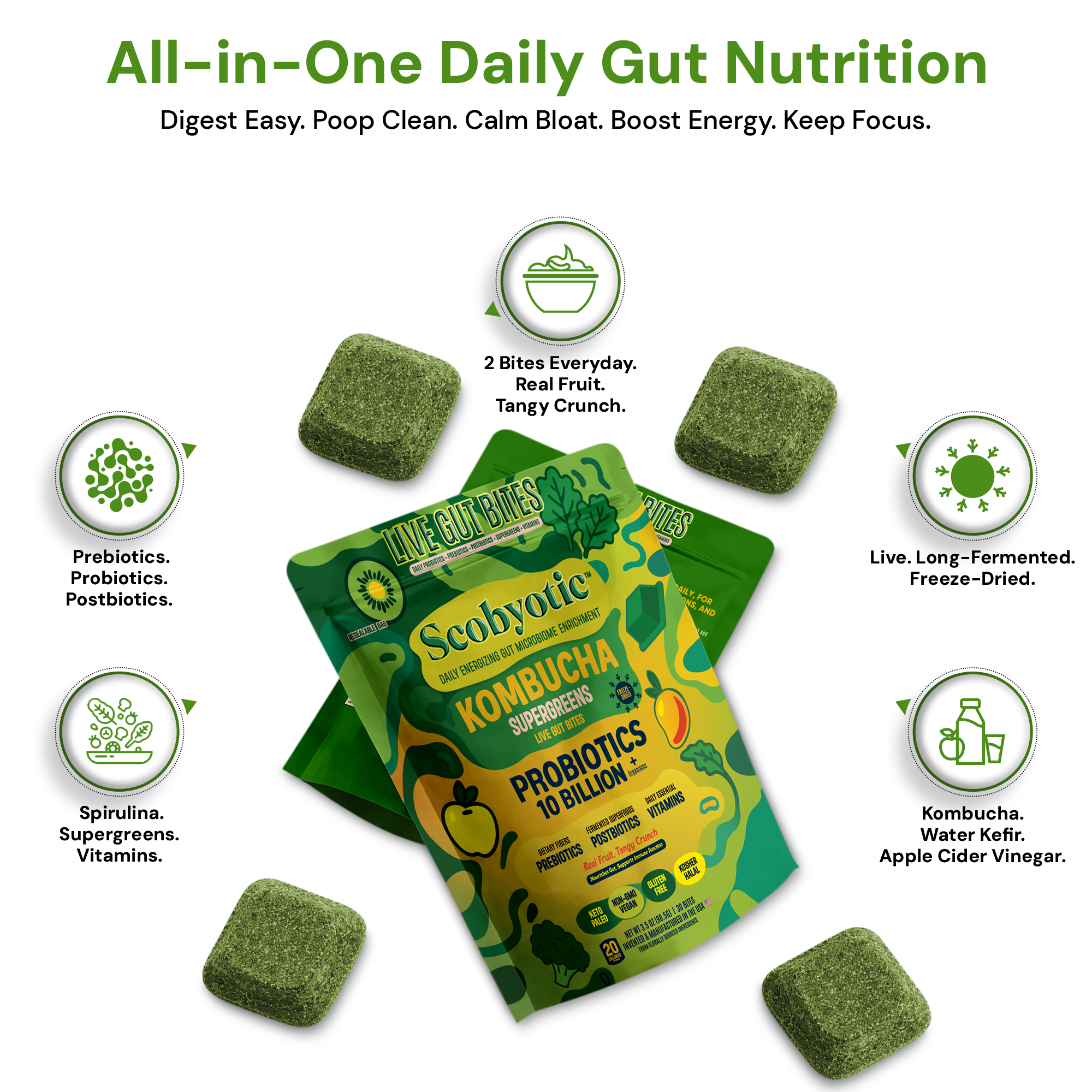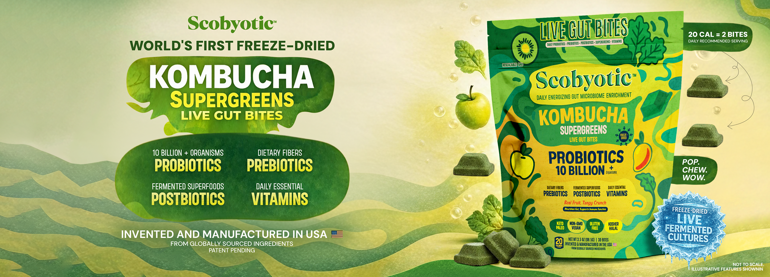 Scobyotic™ is a live freeze-dried bite made with long-fermented cultures of organic kombucha, apple cider vinegar, and water kefir. Not a pill, powder, or sugary gummy — just a freeze-dried bite designed for everyday use.