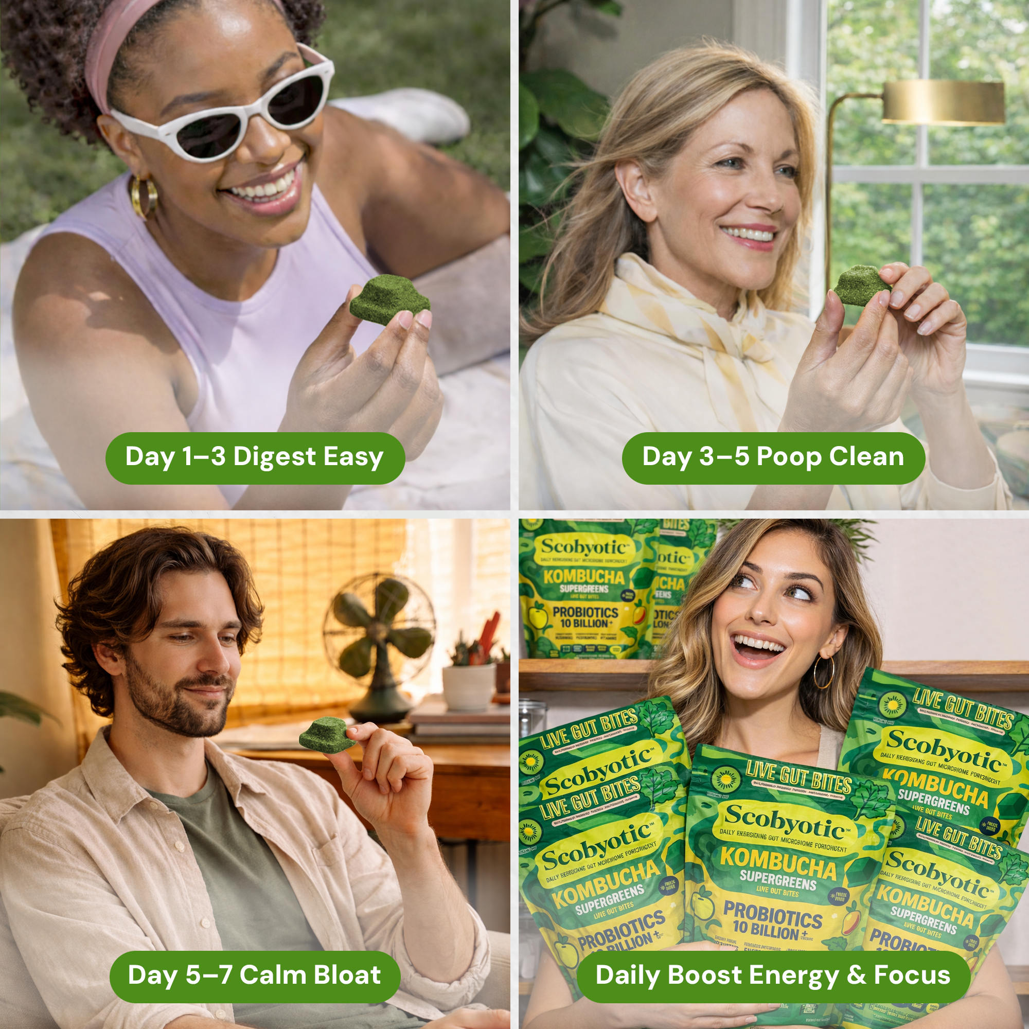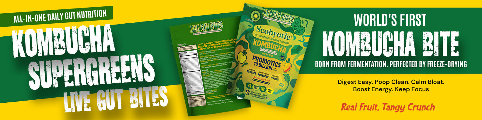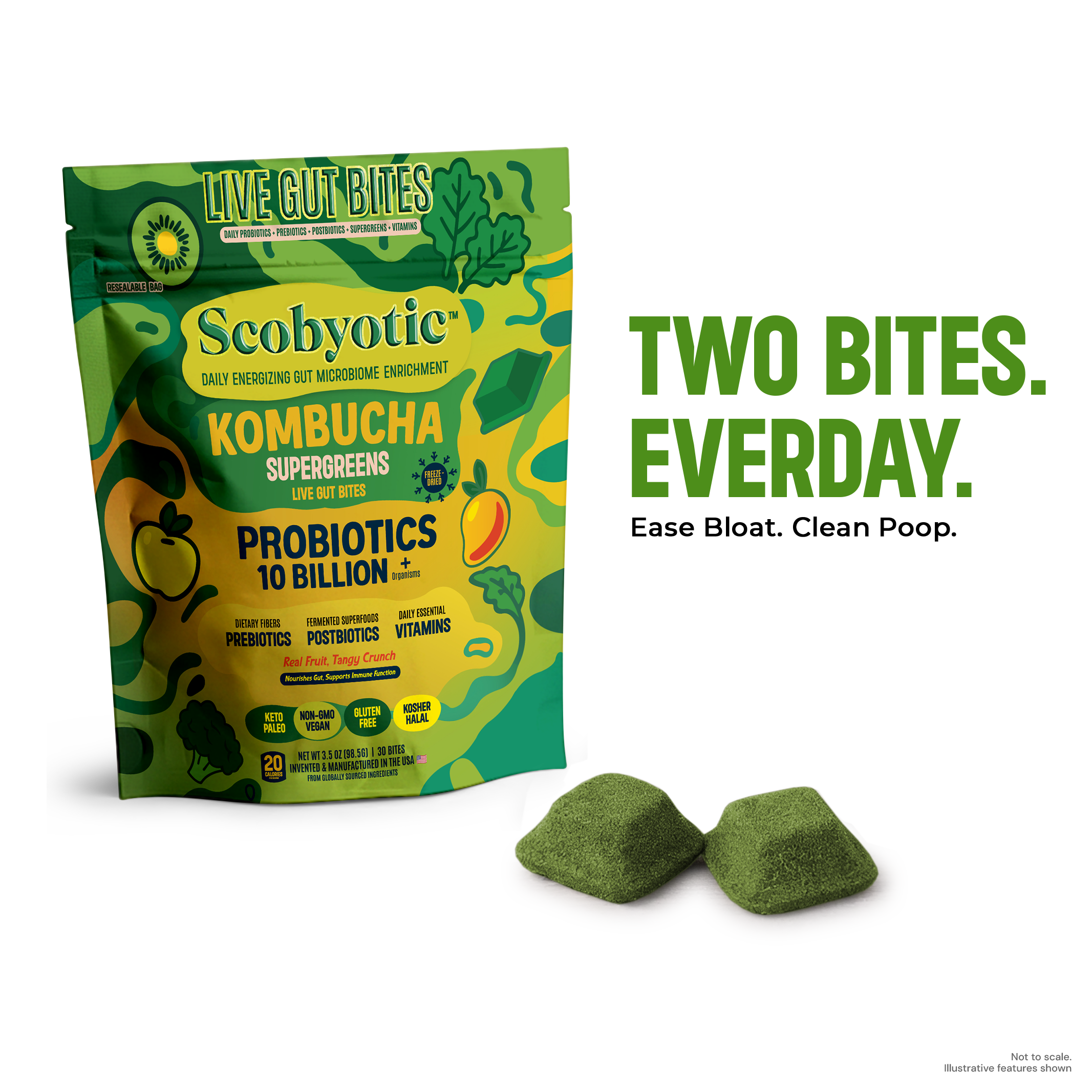 Scobyotic™ is a live freeze-dried bite made with long-fermented cultures of organic kombucha, apple cider vinegar, and water kefir. Not a pill, powder, or sugary gummy — just a freeze-dried bite designed for everyday use.