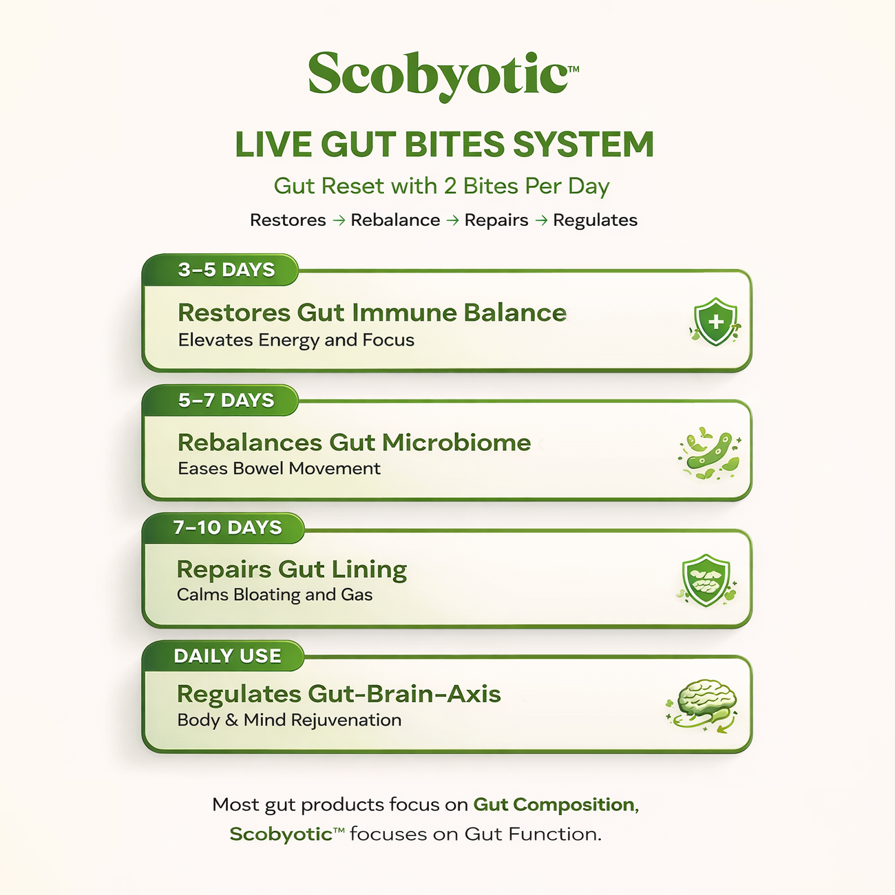 Postbiotics are powerful signaling messengers for Gut-Brain Axis neurotransmission, Gut-Immune balance and Gut Barrier Reinforcement, which in turn support digestion, immunity, energy, focus, stress and cravings.